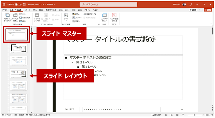 画面左側の一番上にある少しサイズの大きいサムネイルが 「スライド マスター」です。基本的にはスライド マスターで加えた編集がレイアウトに引き継がれる のですが、レイアウトに個別の編集が加わっている場合はスライド マスターの編集がレイアウトに反映されないことがあります。