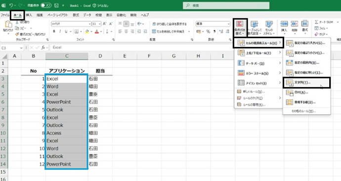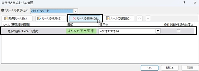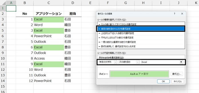「条件」は、セルに “Excel” という文字列が含まれていることです。