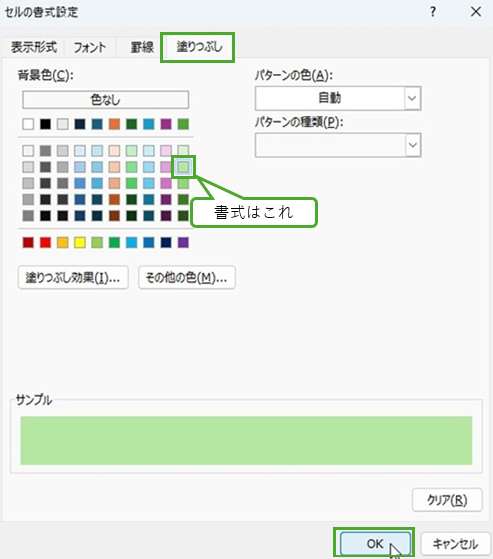 「セルの値が “Excel 基礎” と等しいときに、緑色の塗りつぶしを設定したい」ので、 [セルの値が] [次の値と等しい] [Excel 基礎] という条件を設定し、適用する書式 (塗りつぶしの色) を設定します。