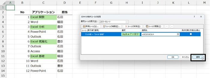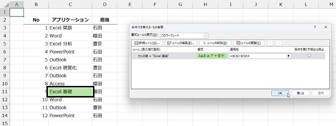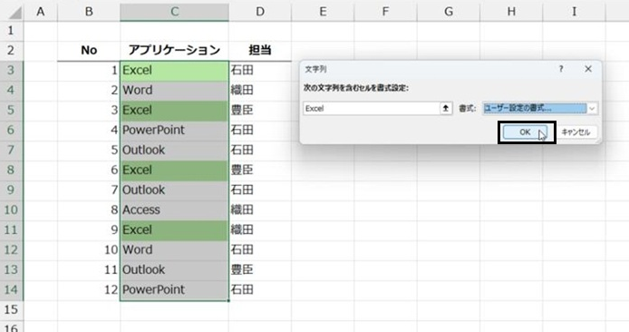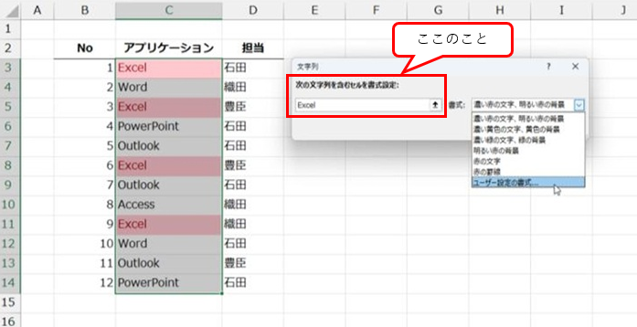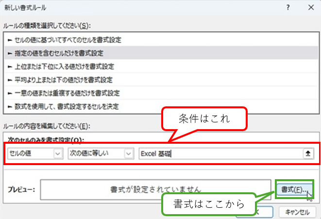 ということは、塗りつぶしの色を変えたければ [書式] をクリックして変更すればよいし、“Excel” という条件を変えたければ右端のボックスで修正すればよい、ということです。