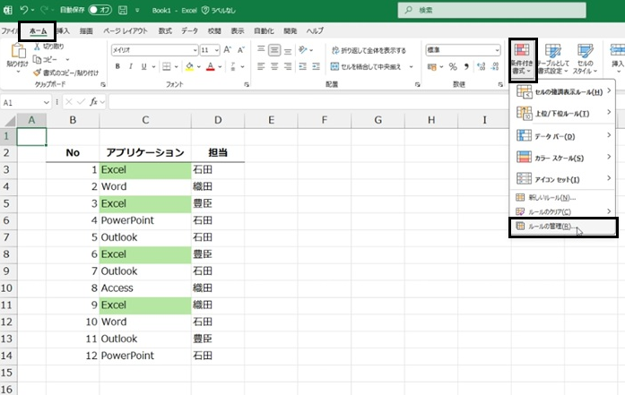 条件付き書式は、その名のとおり、条件を満たすセルに自動的に書式を適用する機能です。
