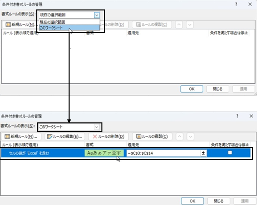 最初に [条件付き書式] - [セルの強調表示ルール] - [文字列] で条件付き書式を設定したときに、[文字列] ダイアログ ボックスに「次の文字列を含むセルを書式設定」と書いてあったのを覚えていますか?(← 覚えておいて、といってない。ごめんなさい。)