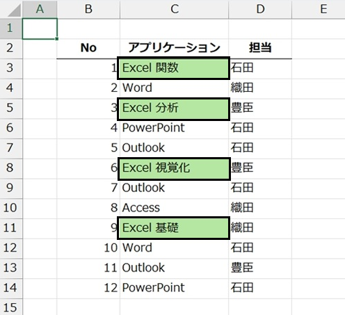 だから、こんな風に ↓ “Excel” という文字列が含まれていれば、“関数” や “分析” などの文字列が含まれていても条件が満たされて、書式が適用されます。