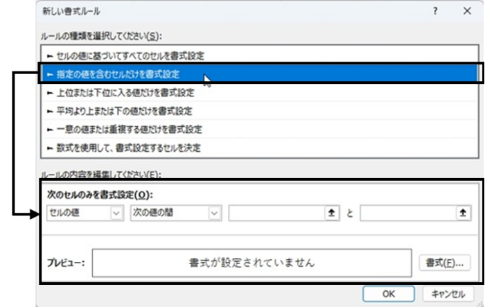ダイアログ ボックスの表示直後は、[セルの値に基づいてすべてのセルを書式設定] が選ばれているのですが、ここで使う [指定の値を含むセルだけを書式設定] をクリックすると、ダイアログ ボックスの下半分の設定項目が変わります。