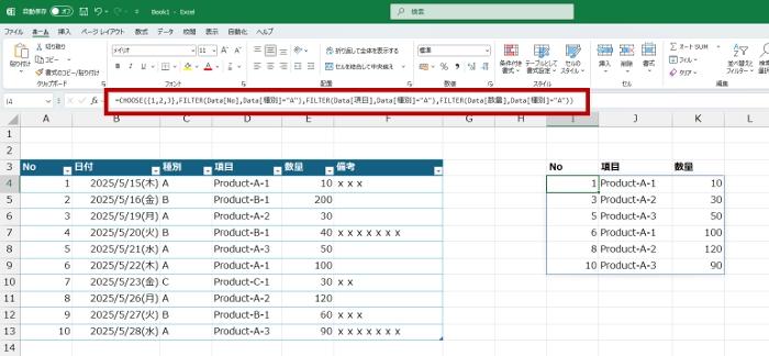 =LET( 条件, Data[種別]="A", CHOOSE({1,2,3}, FILTER(Data[No], 条件), FILTER(Data[項目], 条件), FILTER(Data[数量], 条件),)