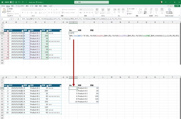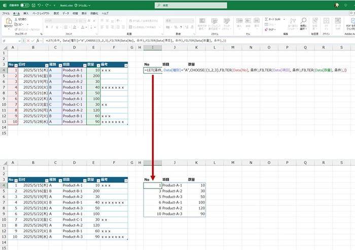 =LET( 条件, Data[種別]="A", 列1, FILTER(Data[No],条件), 列2, FILTER(Data[項目],条件), 列3, FILTER(Data[数量],条件), CHOOSE({1,2,3},列1,列2,列3))