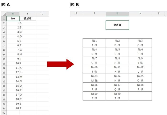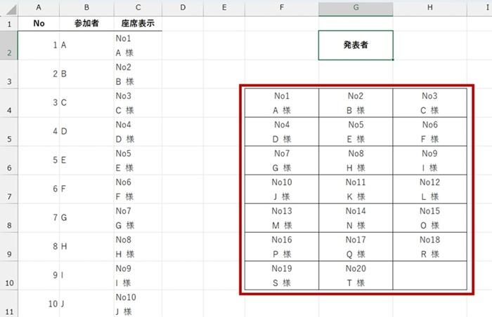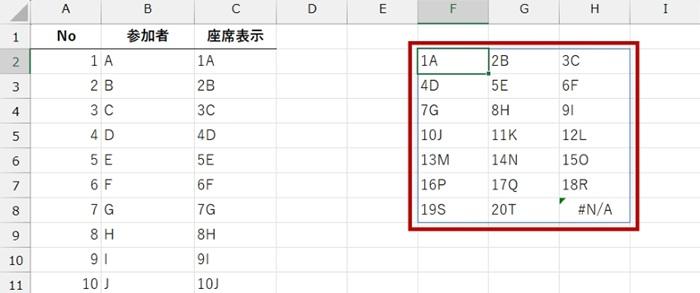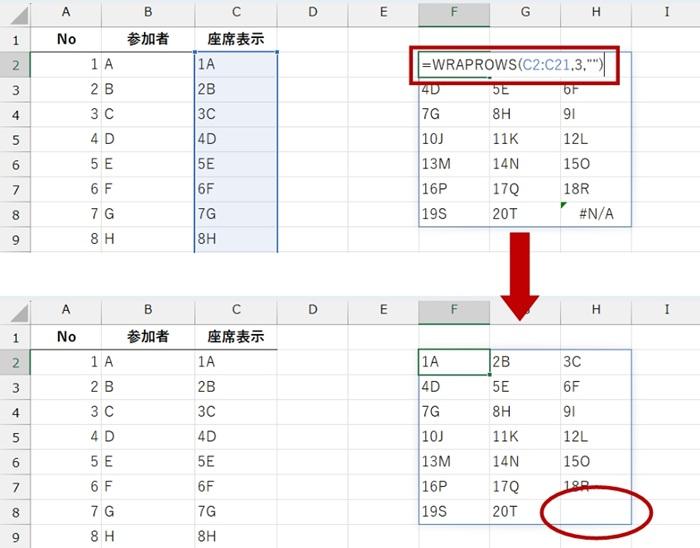 WRAPROWS 関数の本質とは違いますが、今回は座席表をイメージしているので、完成イメージのように表示するために元データを加工します。