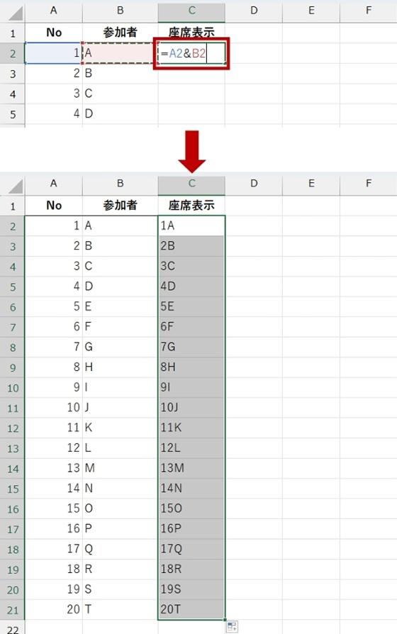 ここでは最終的に No と 参加者名 (アルファベット) を組み合わせて表示したいので、C 列に「&」を使って文字列結合します。 TEXTJOIN でもよいけれど、あとで改行などの加工をしたいので、あえて「&」で結合しています。