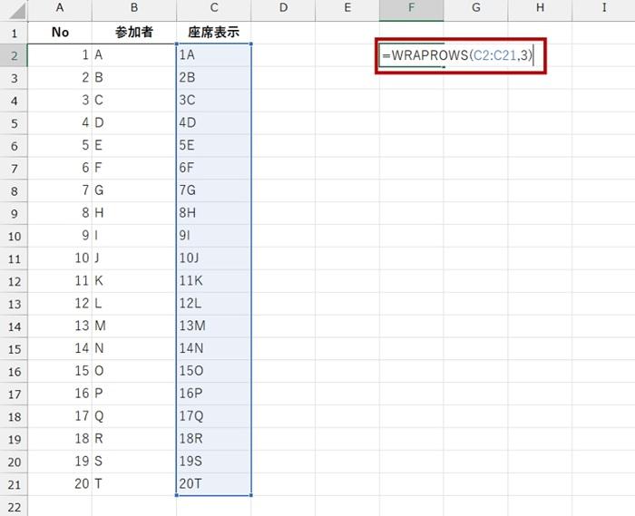 ここでは、セル C2 から C21 を 3 列で折り返す表を作りたいので、「=WRAPROWS(C2:C21,3)」としています。