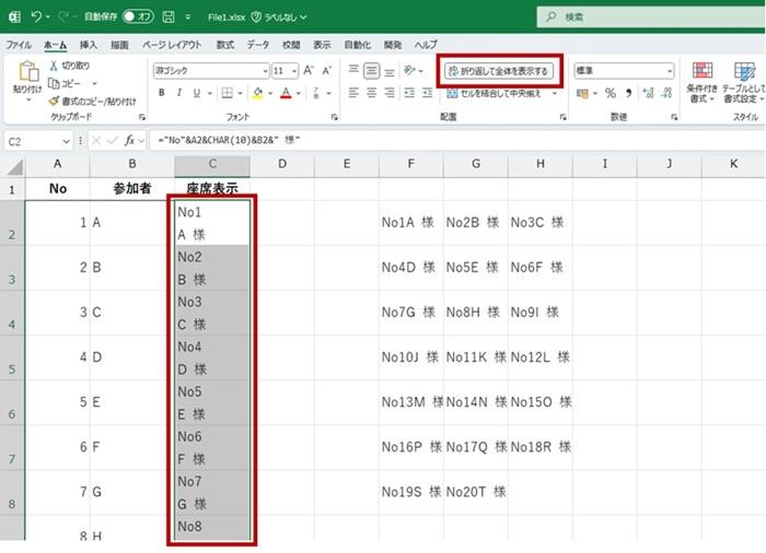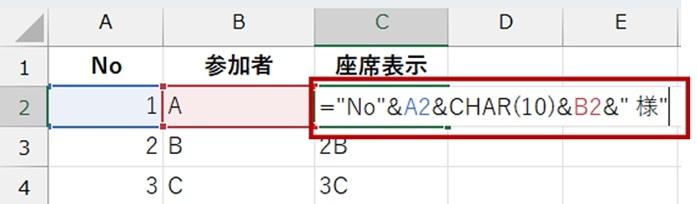 座席表示 (C 列) の数式を編集します。 ここでは、「No」という文字列を冒頭に表示し、改行したうえで、名前の後ろに「様」が表示されるように編集しています。 「CHAR(10)」は、改行コードを指定する数式です。