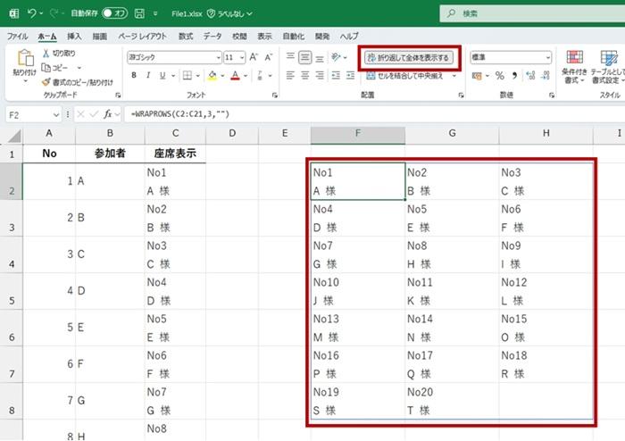 WRAPROWS の結果には、元データのセルの書式はついてこないので、作成した結果のほうにも [折り返して全体を表示する] を設定します。