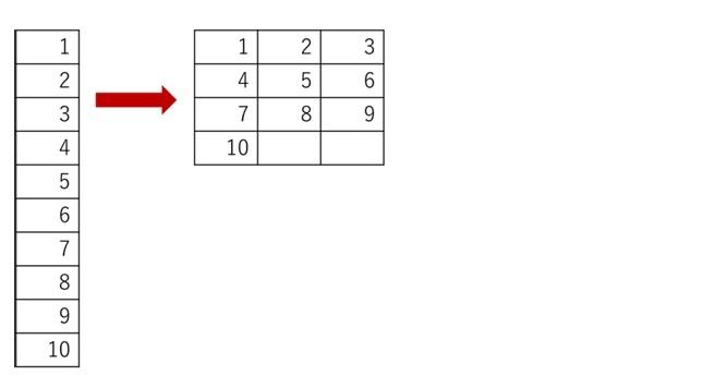 ここでは、3 列で折り返す表を作ります。 第 3 引数を省略するとどうなるか確認してから、数式を修正して対応します。