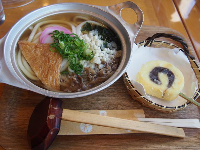 道後温泉本館の目の前、2Fに上がるとかわいらしいカフェがあります。ここでは松山で定番の和菓子「一六タルト」の天ぷらが味わえます!食べ方は塩を少しかけて食べるのだそう。