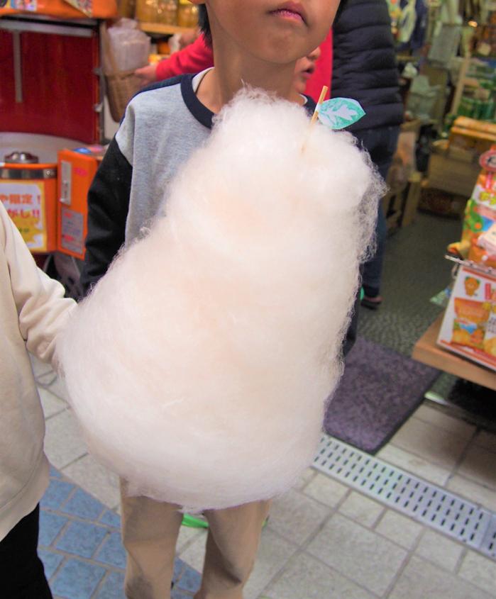 道後商店街には魅力的なお土産屋さん、飲食店もたくさん!中でも作って楽しいのが「ひめや」さんの世界初⁉とも言われるみかんわたがしです。1回200円で、お店の方にレクチャーしてもらい、自分でわたがしを作ることができます。