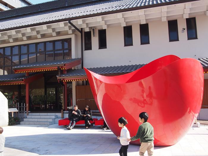 温泉に入らなくても、入口前だけでも十分楽しめます。時間ごとに噴き出る噴水に、子どもたちは大はしゃぎ!ずぶぬれ必至です…。大きな椿のアート作品も見ごたえがあります。