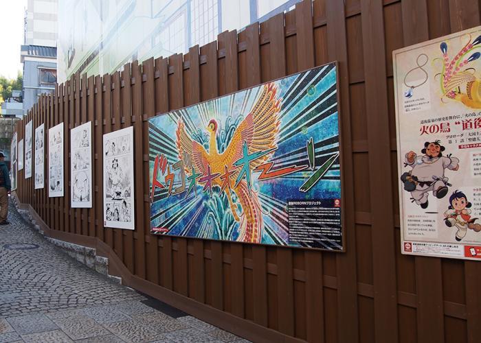 営業しながらの保存修理工事中の道後温泉本館。空の散歩道からも眺められるのがラッピングアートです。工事用の素屋根と呼ばれる覆いに、あの手塚治虫先生のライフワークといえる「火の鳥」が描かれているのです。